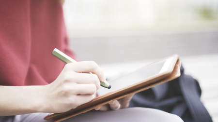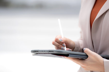 Close up hand caucasian businesswoman writing on digital tablet outdoors in city, business woman concentrating and note on tablet in business district, employee in modern city, planning marketing.