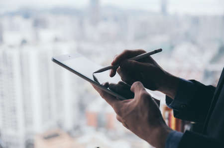 Close up hand of businessman use pen with tablet. Concept of technology for business.