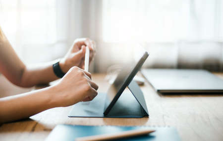 Focus on hand young asian woman holding stylus pen and using digital tablet working or meeting online. Concept Work from home with new normal