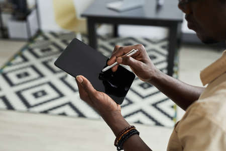 Close-up view of passionate freelancer working on his project while writing on blank screen tablet