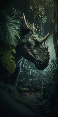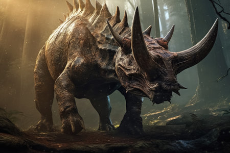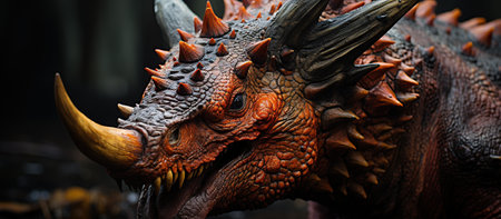 Triceratops dinosaur in the forest, closeup of photo