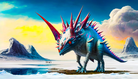 a realistic and hyper-detailed rendering of a dracopunk-inspired animal with big teeth and horns. the spiky mounds in the background add to the dynamic and action-packed scene. the light cyan and red colors create a striking contrast, while the realistic textures bring the creature to life. this artwork showcases the artist's skill in creating realistic depictions with a touch of fantasy. ai generated