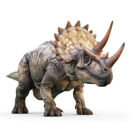 Digitally rendered image of a large, prehistoric horned dinosaur, displayed against a plain white backdrop. The creature is posed in a walking stance.