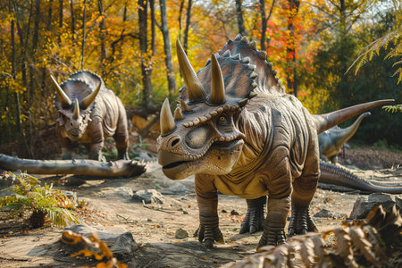 View of the giant triceratops dinosaurs in an ancient environment. Ancient creatures in their natural habitat. Prehistoric natural landscape with dinosaurs