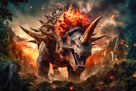 A terrible dinosaur Triceratops with an open huge mouth against a background of fire and smoke in the burning primeval jungle. Death of the dinosaurs