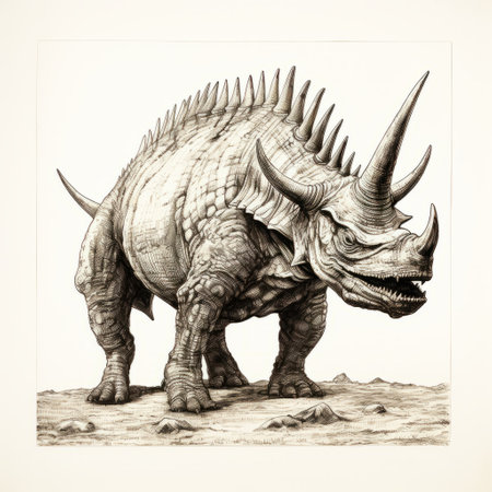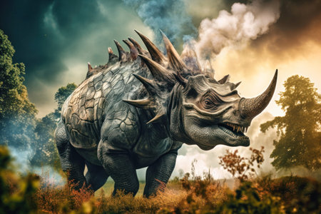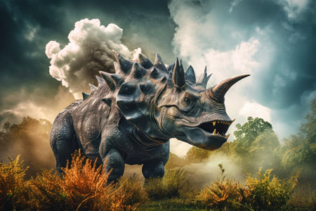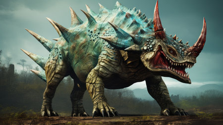 the styracosaurus, a majestic ceratopsian dinosaur, is imaginatively reimagined with a menacing scorpion tail, blending prehistoric ferocity with arachnid menace, showcasing a fantastical creature that would have ruled the ancient landscapes with its distinctive frill and razor-sharp claws. ai generated