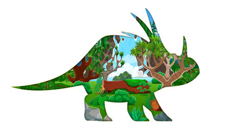 Paper cut dinosaur silhouette with prehistoric landscape inside. Jurassic styracosaurus dino animal vector 3d paper cut silhouette with cartoon jungle forest landscape of tropical trees and waterfall