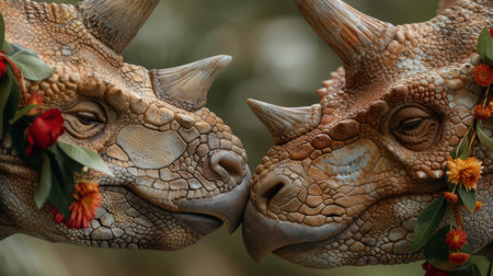 triceratops in the woods, a close-up shot showcasing the realistic rendering of the human form in a dark orange and white color scheme. this 8k 3d image with gritty textures and daz3d style captures the majestic presence of the triceratops in a 32k uhd resolution. ai generated
