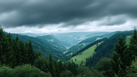 Scenic view of rolling green hills under a dramatic, overcast sky. The lush forest stretches across the valley, providing a serene and peaceful atmosphere.