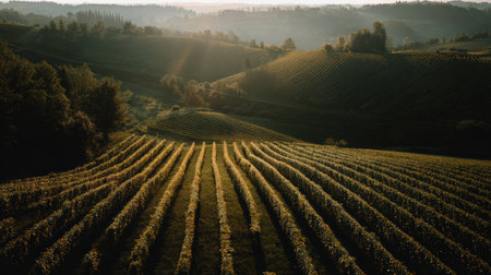 Warm golden sunlight sets over a picturesque vineyard, highlighting lush rows of grapevines in the serene countryside.