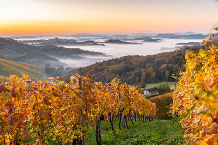 Autumn View from South Styrian route in Austria at hills in Slovenia during sunraise. Autumn at Vineyard theme.