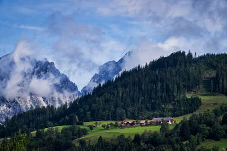 Natural rural landscape with traditional wooden houses in the valley of Enns River at the foot of Rossbrand mountain, part of the Salzburg Slate Alps, Austria
