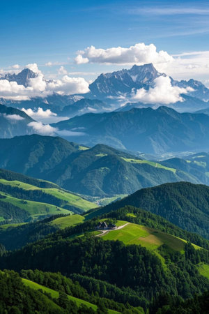 Majestic mountains in the Alps covered with trees and clouds