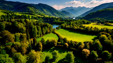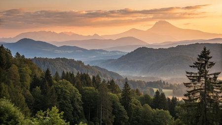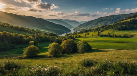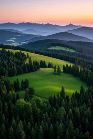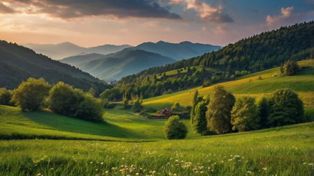 Green fields and sunset views among the mountains and forests