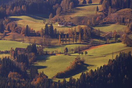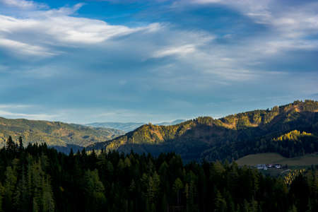 Stunning mountain view from Slovakia - forest and farm in the autumn around morning time, in the first sunshine, little foggy view