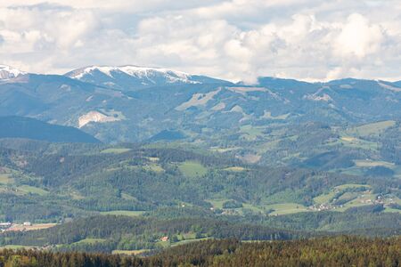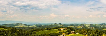 Panorama of Vineyards in south styria in Austria. Landscape of Leibnitz area from Kogelberg. Tourist destination, Green hills of grape crops and mountains.