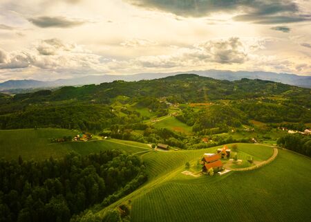 Gorgeous sunset over beautiful green vineyards. Aerial panorama sunset over Austrian grape hills in spring. Wine culture in south styria, tuscany like tourist famous spot.