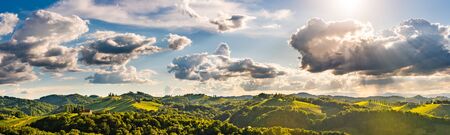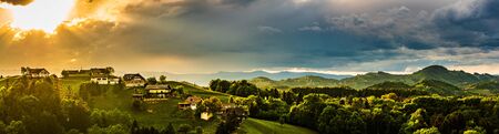 Panorama of South Styria Vineyards landscape in Eckberg near Gamlitz ,Austria. View at Vineyard fields in sunset sun in summer. Tourist destination.