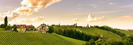 Panorama of South Styria Vineyards landscape near Austria - Slovenia border. View at Vineyard fields in sunset in spring. Tourist destination.
