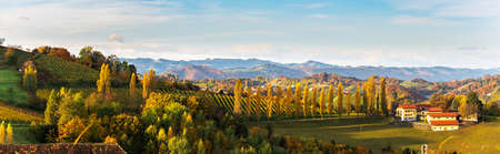 South styria vineyards panorama, Tuscany of Austria. Sunrise in autumn. Colorful trees and vieyard at top of hill with poplar trees