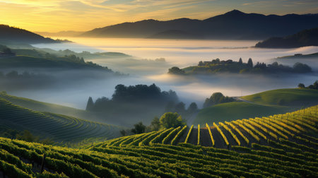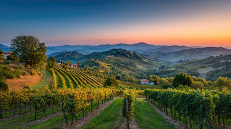 Explore the breathtaking beauty of a vineyard during sunset, showcasing rolling hills and distant mountains. This serene landscape captures the essence of peaceful countryside life.