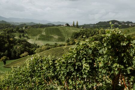 A lush wine region is South Styria, Austria. The wine plantations are stretching over a vast territory, over the many hills. There grapes are already ripening. Wine region. A bit of overcast.