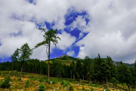 pine trees while hiking in the mountains with many white clouds on the sky