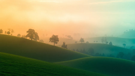 Landscape of green hills and trees with fog in the morning.