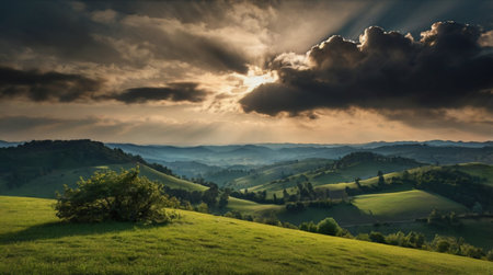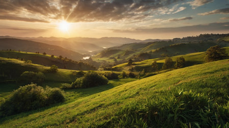 This image showcases lush rolling hills and distant mountains, highlighting the tranquil beauty of nature. A perfect scene for promoting travel and outdoor experiences.