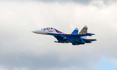 Moscow Russia Zhukovsky Airfield 25 July 2021: aerobatic Su-30 perfoming demonstration flight of the international aerospace salon MAKS-2021.