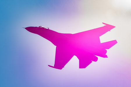 Silhouette of fighter jet on the blue sky background. Airplane silhouette.