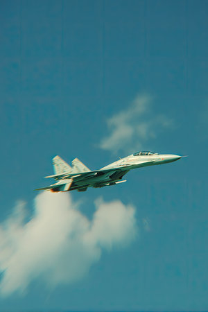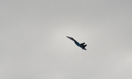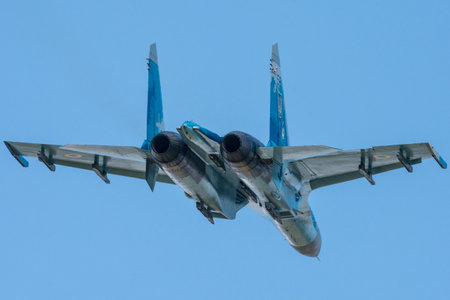 FAIRFORD, UNITED KINGDOM - JULY 13, 2018: Sukhoi Su-27P Flanker of the Ukrainian Air Force performing a demonstration flight at the Royal International Air Tattoo at RAF Fairford, England