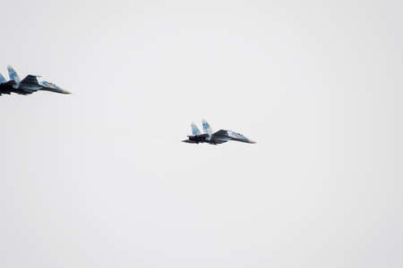SAINT PETERSBURG, RUSSIA - April, 25, 2015: Flying display and aerobatic show of Russian Knights (Russkie Vityazi) Su-27