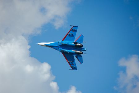 Kubinka, Moscow Region, Russia - April 5, 2011: Sukhoi Su-27 of russian knights aerobatics team jet fighter showing demonstartion flight at Kubinka air force base.