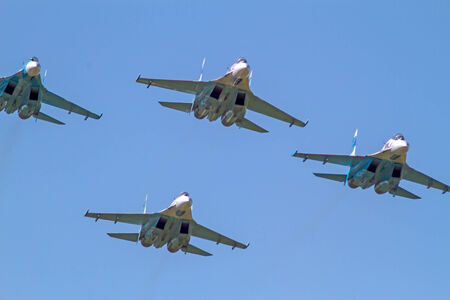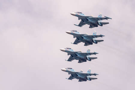 Tambov, Russia, May 31, 2014: Traditional air show in Tambov. Four jet fighter aircrafts Su-27 (Flanker) front view. Sunny summer day