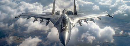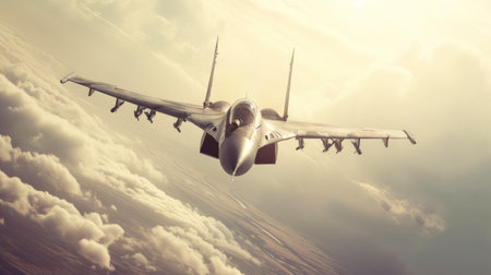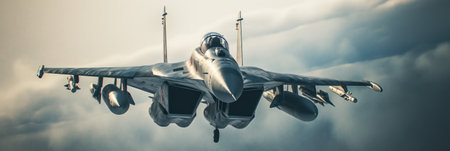 Military jet airplane flying above dramatic clouds, high speed aviation technology and air force defense concept suitable for industry magazines posters and news
