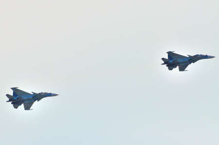 MOSCOW, RUSSIA - AUG 2015: Aerobatic display team Falcons of Russia on Su-27 and Su-34 at the 12th MAKS-2015 International Aviation and Space Show on August 28, 2015 in Moscow, Russia