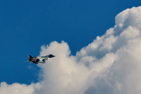 Fighter Su-57 (Sukhoi T-50 PAK-FA) fifth generation airplane performing demonstration flight during MAKS-2017 airshow at Zhukovsky,Ramenskoe airport. JULY 18, 2017. ZHUKOVSKY, MOSCOW REGION, RUSSIA