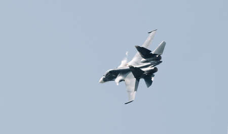 Moscow Russia Zhukovsky Airfield 31 August 2019: aerobatic Su-35 perfoming demonstration flight of the international aerospace salon MAKS-2019.
