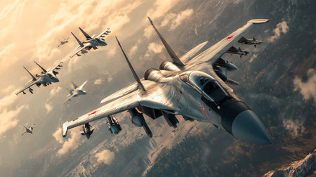 A formation of fighter jets maneuvering through the sky with precision and speed, Aerial view of fighter jets in formation over a snow-covered landscape, AI Generated