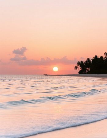 Experience the tranquility of a stunning tropical beach at sunset, featuring gentle waves lapping at the shore, surrounded by lush palm trees and majestic mountains.