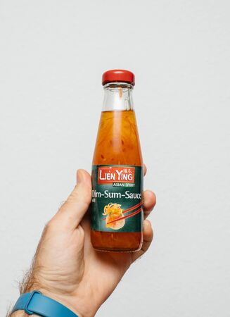 Paris, France - Dec 17, 2017: Man hand holding delicious Lien Ying Dim Sum Sauce sweet delicious accompaniment for Asian food plates