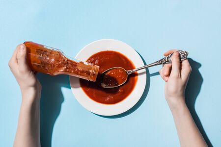 Cropped view of woman holding spoon and pouting delicious tomato sauce in plate on blue background