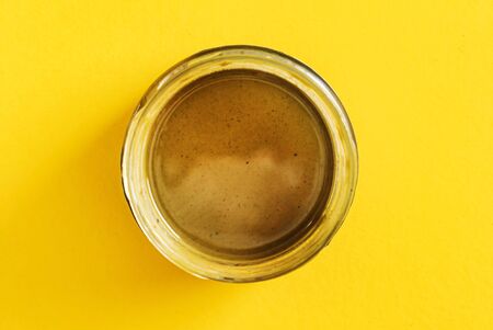 Set of many mustard in yellow bottle with brown tissue paper prepare for customer