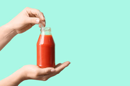 Sauce in glass jar frozen in the air. Pouring homemade DIY natural canned hot tomato sauce from small jar to white ceramic pot. Color of 2020 year. Classic Blue, food trendy background.