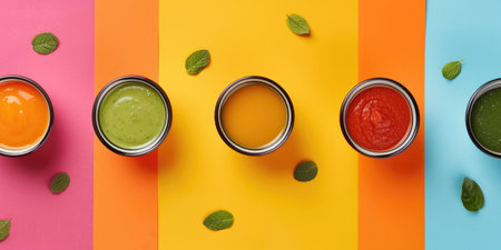 horizontal banner, set of small round saucers with different sauces for meat, fish and fast food, top view, row, bright blue yellow pink orange background