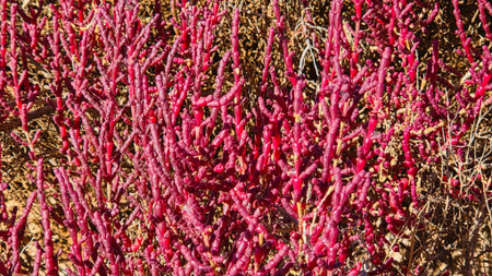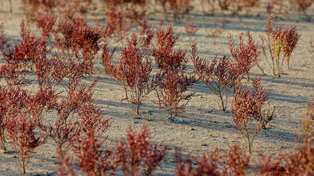 field on the shore of a salt lake with a flowering plant of bright red salicornia, soft focus.