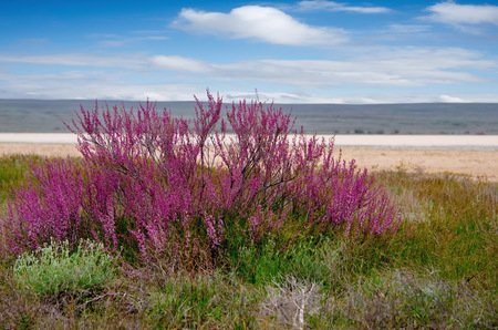Bright red small flowers or flowering bushes in the steppe with salt protrusions and a sunset with dramatic cloud on the background. Beautiful natural landscape on the salt lake