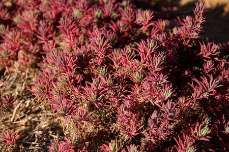 Seablite (Sueda maritima) growth in acid soil. Acid soil indicator plants. Pink Seablite. Acid loving plants. Valentine's day background. Exotic plant with pink leaves.