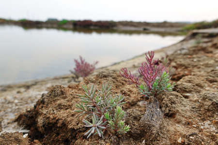 Green with red color plant growing near pink lake in the mud in Sivach
